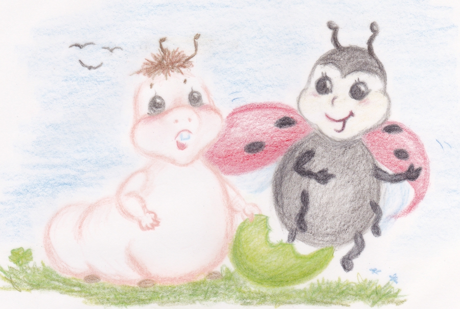 unser Räupchen wundert sich noch, da taucht direkt noch so ein Luftwesen auf. Räupchen fällt fast sein 3. Frühstückblatt aus der Hand und es möchte jetzt unbedingt wissen wie man in der Luft herumschwirren kann. Es fragt ganz höflich nach dem Namen des Wesens und stellt sich auch vor. Es stellt sich heraus das es Marie die Marienkäferdame ist und sie erklärt ihm ganz ausführlich dass dieses herumschwirren fliegen heißt, und das es mit den Flügeln geht, die sie an ihrem Rücken hat. Marie ist sehr nett und zeigt unserem Räupchen alles ganz genau. Räupchen schaut verstohlen auf seinen Rücken und Marie lacht. Nein das fliegen geht nur mit diesen Flügeln und wenn man keine hat kann man nicht fliegen. Räupchen muss erst mal über alles nachdenken und bedankt sich bei Marie, die auch gleich fortfliegt. Unser Räupchen blickt ihr lange nach…