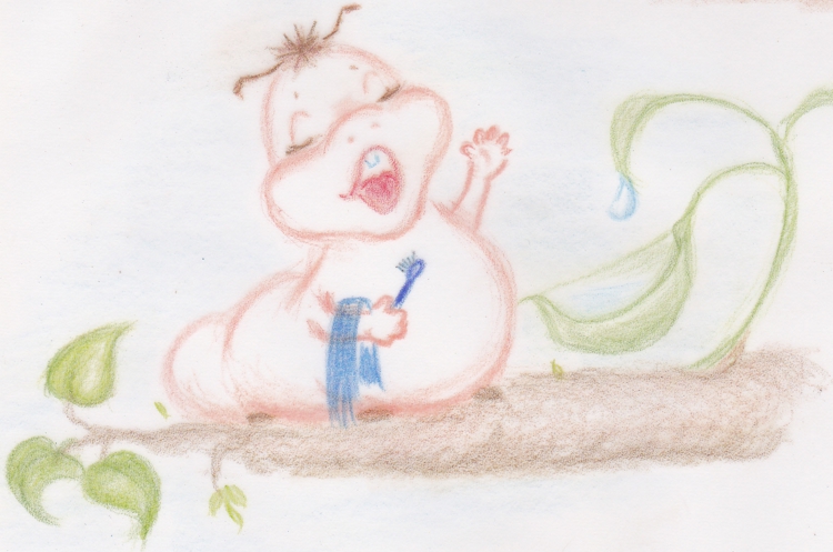 zuerst einmal das Zähnchen putzen! Das Zähnchen ist superwichtig und will gepflegt werden, denn es wird gebraucht zum futtern. Da unser Räupchen ständig Hunger hat und gaaanz viel futtern muss, putzt es jeden Morgen erst mal sein Zähnchen. Ein Tautropfen fällt netterweise in sein Zahnputzwasser und so kann es losgehen.